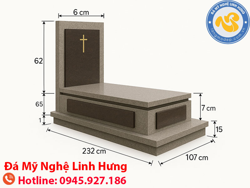 Mộ được thiết kế với kích thước tiêu chuẩn phù hợp cho một phần mộ đơn, đảm bảo sự cân đối và trang nghiêm. Kích thước tổng thể khoảng dài 232 cm, rộng 107 cm và cao 127 cm (bao gồm cả bia mộ). Các thông số này có thể điều chỉnh linh hoạt theo yêu cầu thực tế của từng khuôn viên nghĩa trang, đảm bảo hài hòa về mặt phong thủy và không gian xung quanh.